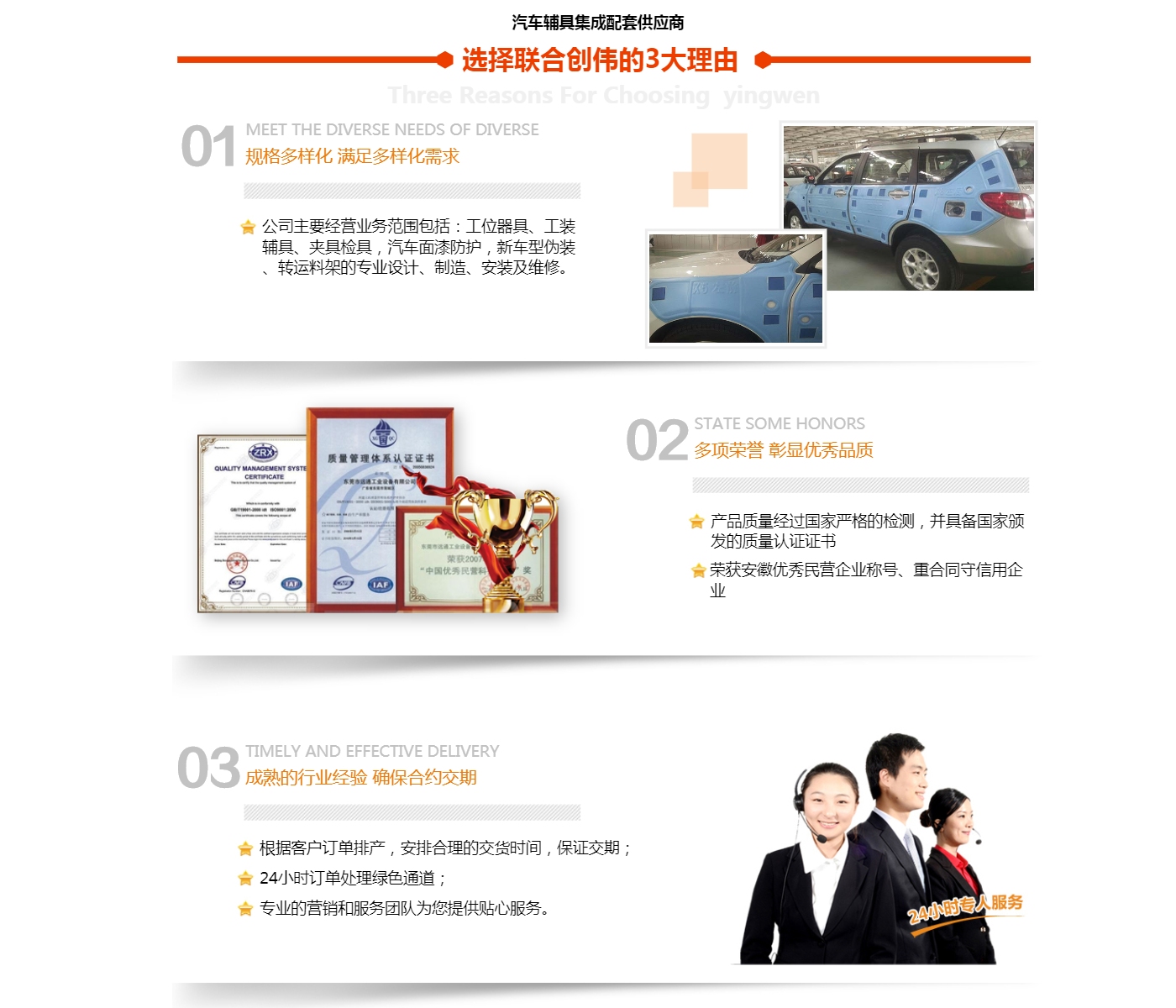 蕪湖聯合創偉汽車技術有限公司,座落于風景秀麗的皖江之畔——安徽蕪湖,緊鄰國家經濟開發區蕪湖經濟開發區。公司本著為客戶創造價值的服務的理念,力求以高的產品工程和優良的售后服務參與市場競爭,獲得社會效益和經濟效益,通過不斷的優化,來滿足客戶日益增長的需求。公司主要經營業務范圍包括:工位器具、工裝輔具、夾具檢具,汽車面漆防護,新車型偽裝、轉運料架的設計、制造、安裝及維修。在此方面有很好的業績,獲得了客戶的廣泛認可和好評。公司宗旨:誠信、服務、進取公司以誠信為企業立足之根本,精心施工、信守合同,向客戶提供的產品和服務,遵循以人為本,以為客戶提供更好價值和堅持用戶滿意為服務目標,...